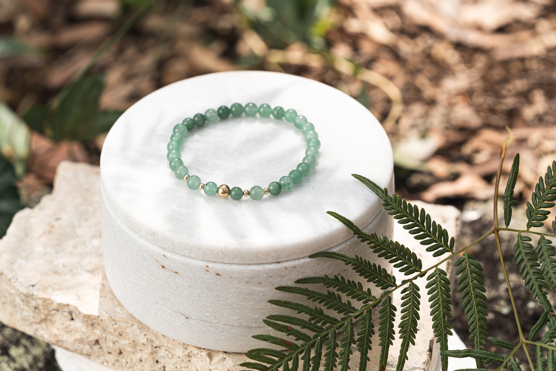 Introducing the My Elysian's Persephone Bracelet - a piece of jewelry that embodies the lush beauty of spring and the nurturing qualities of high-grade Green Aventurine. This exquisite bracelet, accented by your choice of 14k filled gold beads or sterling silver beads, is a testament to nature's abundance and the exceptional benefits of wearing Green Aventurine.
